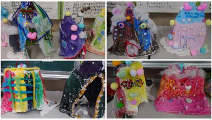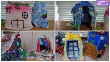 不思議な世界の立体作品が完成してきました。ペットボトルで作った形を生き物に見立てて作ったり、乾いてできた空間を上手く使って建物の入り口にしたりしている子がいました。今回は1組を掲載しました。次回は、2組を掲載予定です。