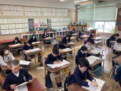 今日も3年生から6年生は、大阪市小学校学力経年調査です。3,4年生は、算数・理科の二教科。5・6年は英語を含めた三教科です。集中してがんばっています!