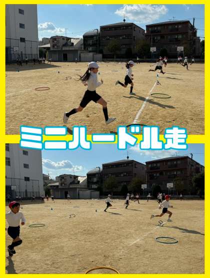 体育ではミニハードル走に取り組み始めました。50m走と同じスピードで障害物をとび越えることを目標にしています。自分に合った障害物の間隔を見つける活動や、どちらの足が踏みきり足なのかを確かめる活動を行いました。