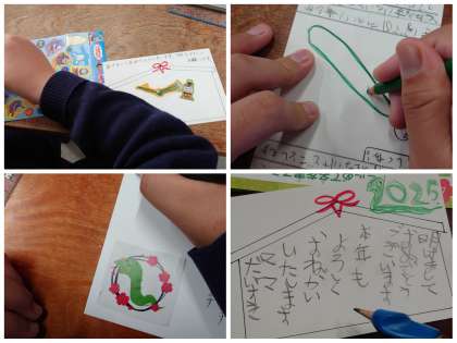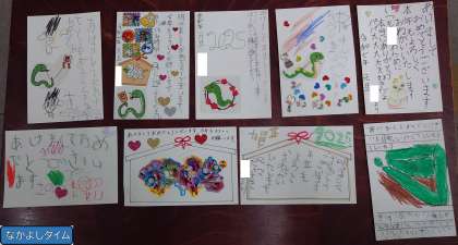 なかよしタイムでは、「年賀状を書こう」をめあてに学習しました。表側には干支のヘビの絵や新年のあいさつを書きました。また、宛名書きも見本を見ながら書くことができました。書いた年賀状が届くのがとても楽しみですね。
