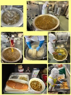 カレーうどんは、牛肉を主材に、うすあげ、たまねぎ、にんじん、青みに青ねぎを使用しています。うどんはゆでて水でしめてから、カレーの中に入れておいしいカレーうどんが出来上がります。寒い時期に体の温まる一品です。児童に大人気の献立です。