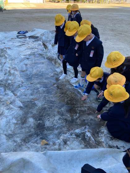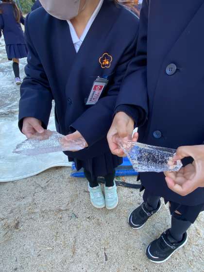 先週はとても寒かったので、バケツや砂場のシートにたまった水が凍りました。