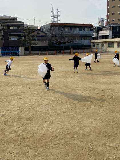 風を袋に集めたり、テープをなびかせたりして楽しみました。