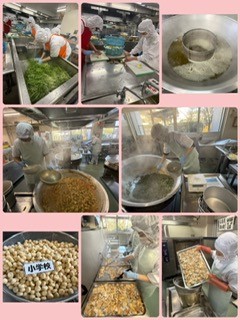 一口がんもとじゃがいものみそ煮はじゃがいも、つなこんにゃく、一口がんも、たまねぎ、にんじん、青みにさんど豆を使用し、赤みそなどで味付けして、煮含めた和風の煮ものです。