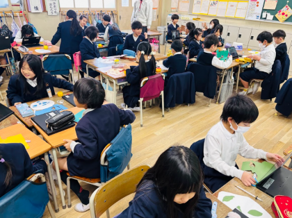 クロームブックで自分の顔をじっくり見ながらじゃんけんで勝った時の笑った顔を作っています。