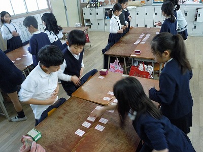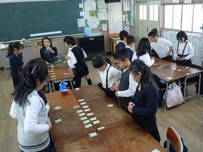 高学年ではよく取り組むのですが、そこは3年生、先生の読む上の句だけではなかなか札を取りにいけません。また、古典仮名使いのため、下の句を聞いても不安な顔をしながら、手を出していました。