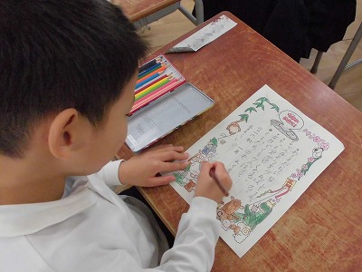 用紙の周りには十二支のイラストもあり、最後には、色鉛筆できれいに色を塗ってくれていました。