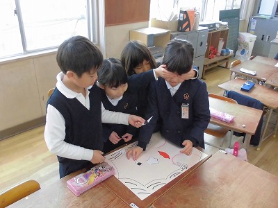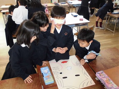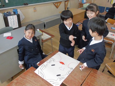 2年生のこのクラスでは、班で「福笑い」をしていました。