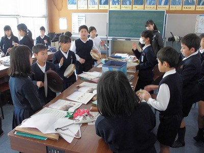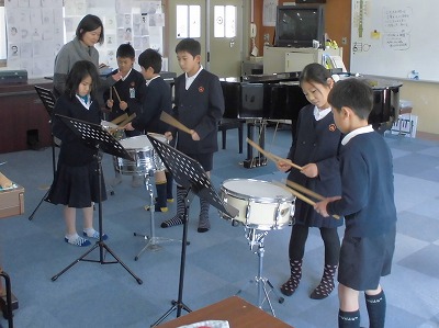 このクラスでは、今日はすず、トライアングル、シンバル、タンバリン、たいこを全員が順にリズムを取りながら演奏していました。