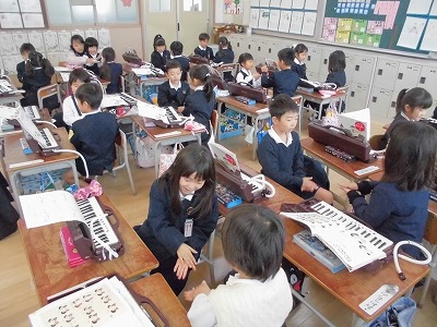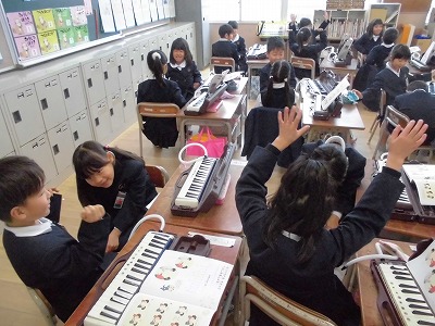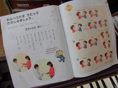 このクラスでは、授業の前半はけん盤ハーモニカの学習をしていたそうですが、後半は教科書にある「わらべうたをうたってたのしみましょう」で「おちゃらかほい」を先生に教わって、お隣の子と楽しそうにしていました。
