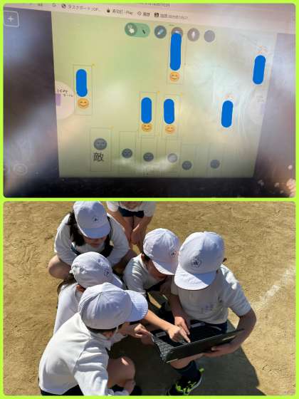 パソコンで作戦を立て、サッカーの試合に臨んでいます。