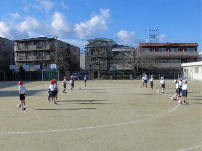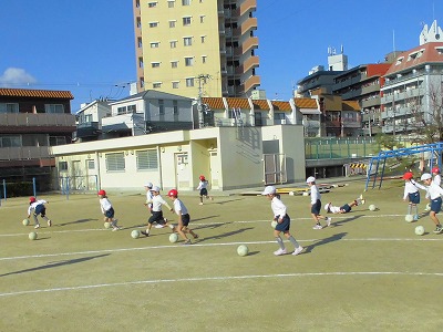 授業の最後は、一人1個のボールで、トラック2周のドリブルでした。