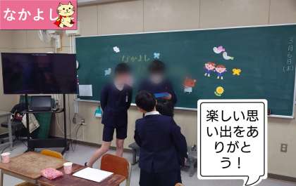 スライドでなかよしタイムなどで交流したことを振り返った後、6年生の好きなもの当てゲームをしました。また、卒業する6年生からはメッセージカードをサプライズでもらいました。