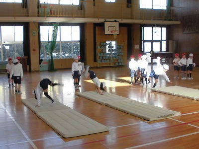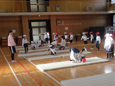 1年生が講堂でマット運動(体育の授業)をしていました。
