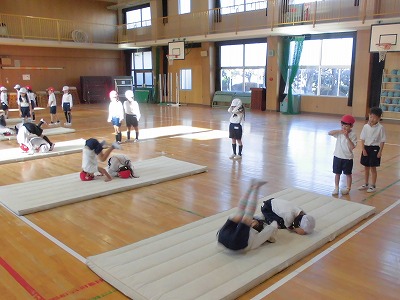 前転はお得意なもので、今日は1人を飛び越える「飛び込み前転」を行っていました。