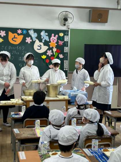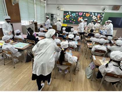 入学したばかりの1年生の教室に給食のお手伝いに行っています。小さい1年生に思わず6年生も笑顔がこぼれます。6年生として、下級生の手本となれるように頑張ります!