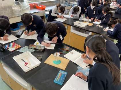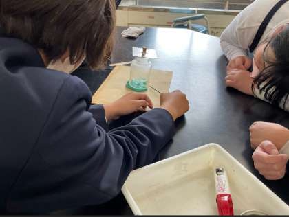 理科の実験です。物が燃えるしくみについて考えています。「どうして火が消えてしまうのかな?」「線香のけむりはどうやって動いている?」よく観察して、考えています。確実に火が消えてからノートを出して記録します。安全に実験をするために、みんな気をつけています。
