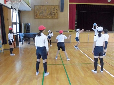 体力作りで、なわとびを行った後、グループごとにサークルとなり、中央の敵2人にボールを取られないようにパス回しの練習をしていました。素早いパス、バウンドさせてのパスなど、敵の動きに合わせたパスができていました。