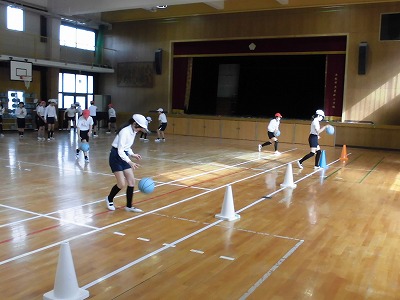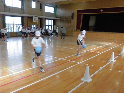 これもグループでのリレー方式です。コーンまで行ってUターンして戻ってきます。この180度ターンが難しいのと、途中にいる敵となった担任の先生がドリブルを阻止してきます。うまくかわしたいところですが・・・・・