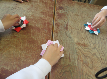 地域の方々から、1年生へ折り紙のこまのプレゼントをいただきました。そのこまを使って遊びました。こまはとてもカラフルで、回るこまを見て、「きれい!!」と喜んでいました。自分たちでルールを作って、友だちと一緒に、何度も遊んでいました。どれだけ長く回し続けることができるか、競って楽しんでいる子どもたちもいました。