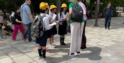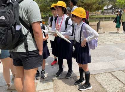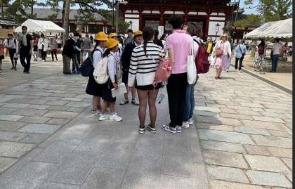 東大寺の見学を終えると、外国語活動です。班で、外国から来られた方々にインタビューをしました。たくさんの方に、快くインタビューに答えていただくことができました。