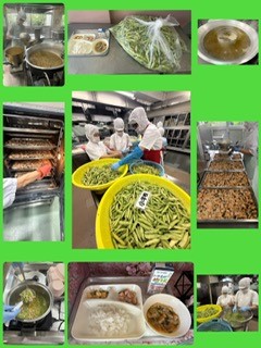 えんどうの卵とじは、約9キロえんどうをさやから豆を出して、使っています。この献立は、卵の除去食対応献立です。