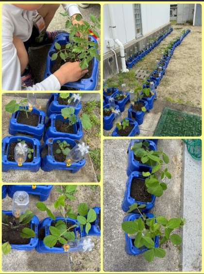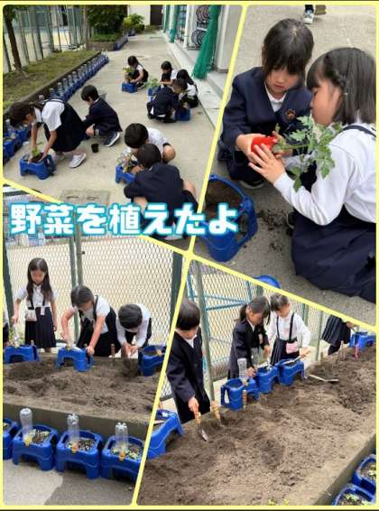 1年生の時に自分で育てたいと決めた夏野菜の苗を植えました。今年も地域の方に希望した苗を提供していただきました。ありがとうございます。子ども達は大変喜んでいます。