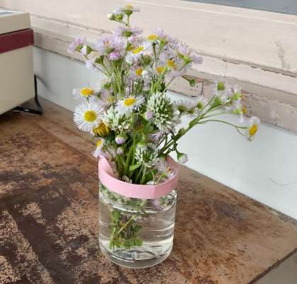 途中、可愛い草を見つけた6年生。「教室に飾りたい」と、花を摘んで教室に持って帰ってくれました。ペットボトルの花瓶に生けています。