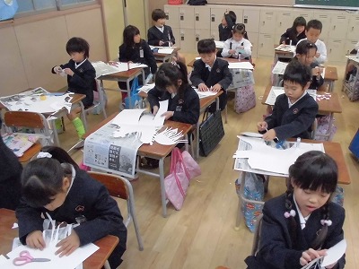 このクラスでは、海(水)の中の生き物を画用紙を切って作っていました。