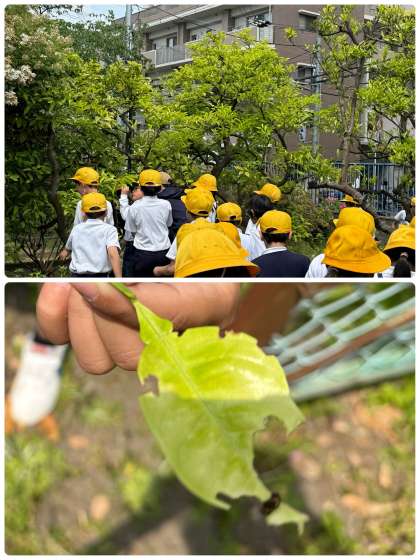 3年生は、理科の学習のために、豊新の森にアゲハチョウの幼虫をさがしに行きました。目をこらして葉のうらや枝を観察し、みんなで協力しながら探しました。