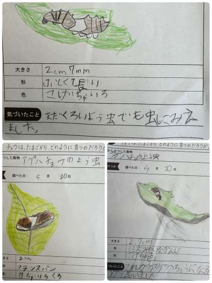 はじめはこげ茶色だった幼虫が、日ごとに姿を変えていく様子に、子どもたちは興味津々。観察を通して「ふとくて長い」「フランスパンみたい」「これがアゲハチョウになるなんてびっくり」など、たくさんの気づきがありました。