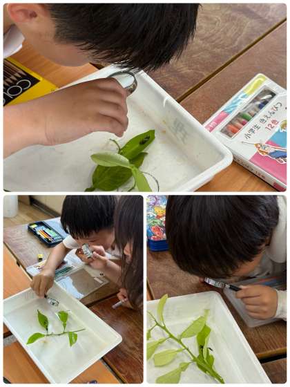 理科の学習で、「豊新の森」で見つけたアゲハチョウの幼虫の観察を行いました。虫眼鏡を使って体の模様や色、大きさなどを詳しく調べ、ワークシートに観察記録をまとめました。