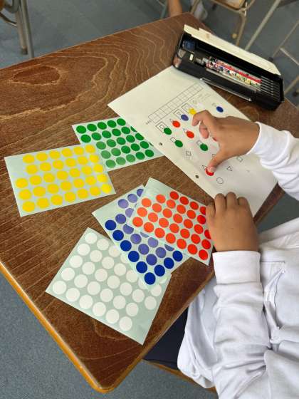ビジョントレーニング(視覚の働きと体の動きを連動させること)です。子どもたちには、分かりやすく「目と手のトレーニング」と伝えています。数字と色を合わせてシール貼りをしました。丁寧かつ効率的に取り組む姿が多く見られました。