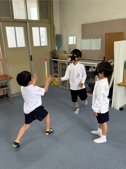 始めは落としてしまうことも多かったのですが、投げ方や距離、かけ声などを子どもたちで話し合って工夫することができました。最後には上手に投げたり受け取ったりすることができました。子どもたちもとても嬉しそうで、教室が温かくなりました♪