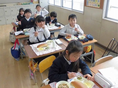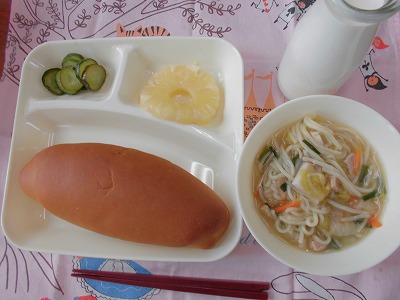 「チャンポン」は、エビ、焼き豚、かまぼこ、白菜、ニラ、もやし、ニンジンが入っていました。豚骨スープ味でとろみもあり、みんなおいしそうに食べていました。