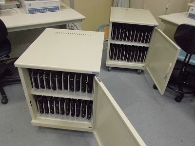 かねてより児童が使用するタブレット端末が各校へと導入されると聞かれていたかと思いますが、とうとう、今日、40台タブレット端末と充電保管庫、画像転送装置の搬入・設定がされました。