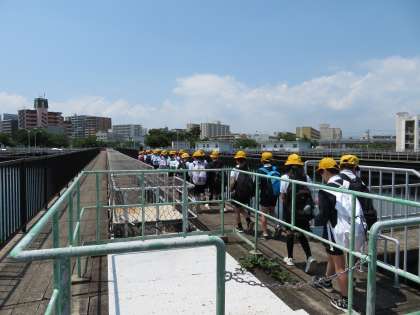 まずは、浄水場の役割や水の流れについて説明を受けました。大きな施設の中には、川から取った水をきれいにするためのさまざまな設備があり、水が少しずつきれいになっていく様子を知ることができました。