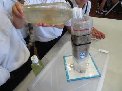 見学の最後には、ろ過の実験も体験しました。川の水が少しずつ透明になっていく様子に、みんな興味津々でした。水がきれいになる仕組みを、自分の目で確かめることができ、楽しそうでした。