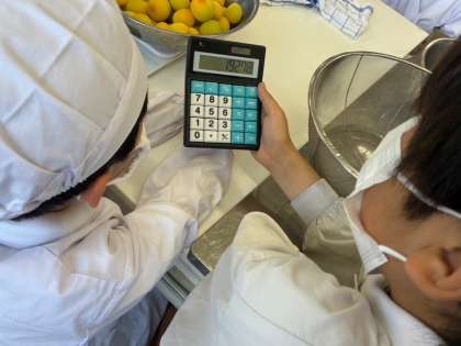 梅の重さを測り、その重さに合わせた量の塩やはちみつを、電卓で計算しました。