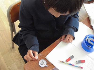 このクラスでは、磁石の学習の後半のようで、今日は、ゼムクリップを磁石にくっつけた後、方位磁針に近づけて指針の振れを確認したり、くぎに棒磁石をこすり付けて磁力を帯びさせて、方位方位磁針のN極やS極に近づけた場合にどうなるかを実験しました。