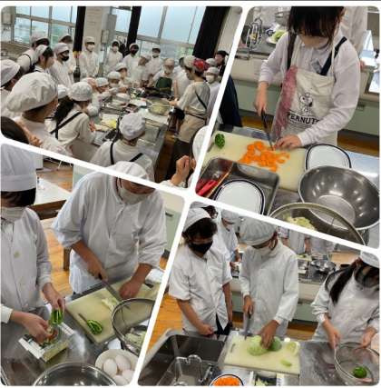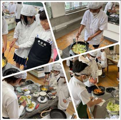 6年生、初めての調理実習では、「野菜炒め」と「スクランブルエッグ」を作りました。5年で調理実習を経験しているので、手際よく活動を進めることができました。