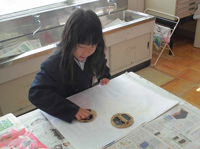 先生にローラーでインクをつけてもらい、紙を置き、ばれんでていねいにこすっていました。