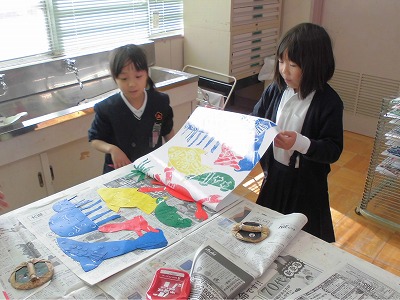 このクラスでは、今までに作成していた紙版画にインクをつけ印刷をしていました。