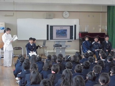 5時間目に多目的室で、東淀中学校の生徒会役員の生徒さん6名から、本校の6年生に東淀中学校の学校紹介をしていただけました。