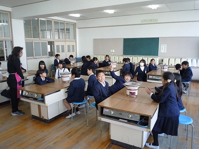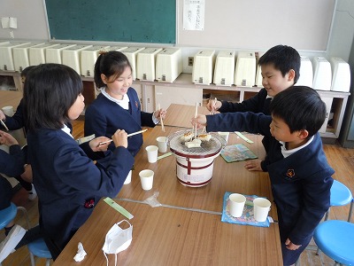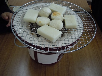3年生が社会科の授業の一環で、昔の道具「七輪」を使って「おもち」を焼きました。