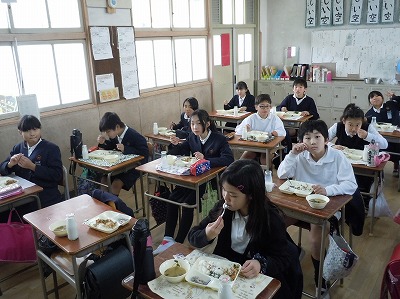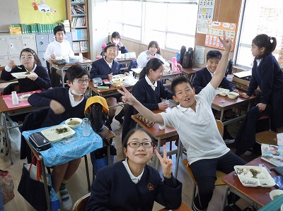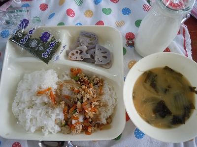 「鶏ごぼうご飯」は、鶏のミンチ肉に、たっぷりのごぼう、こんにゃく、ニンジン、彩りにグリーンピースが入っていました。「いただきます」の後に、ごはんと混ぜ合わせて、きざみのりをふりかけていただきました。しっかりとした味付けで、とってもおいしそうに大口で食べていました。