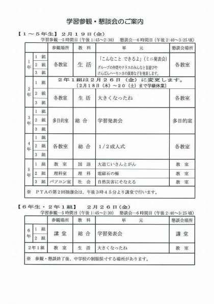 明日、2月19日(金)には、1〜5年生で今年度最後の学習参観ならびに懇談会を実施いたします。〈2年1組のみは26日(金)に延期です〉
