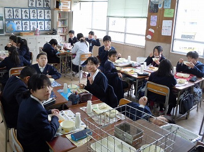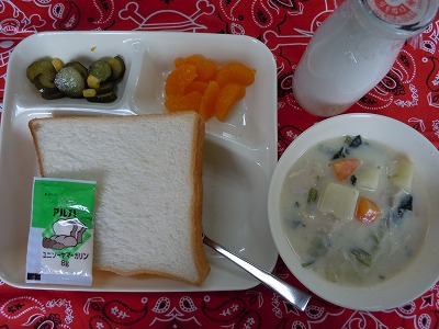クリームシチューは子どもたちの大好物です。パンをちぎってシチューにひたして食べる子も多いです。このクラスでも、お替りで一瞬に食缶は空っぽでした。