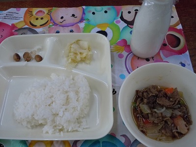 「肉じゃが」は、牛肉たっぷりで、じゃがいも、玉ねぎ、ニンジン、糸こんにゃく、彩りにグリーンピースが入っていました。じゃがいももホクホクでおいしかったです。