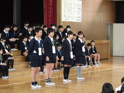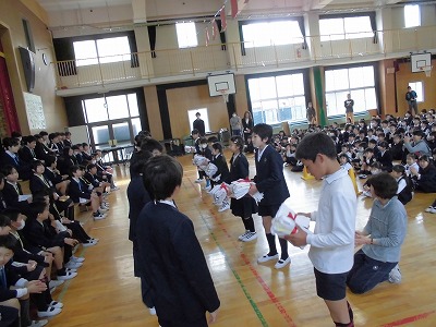 上:各学年の発表を終え、6年生が自分たちで縫った「ぞうきん」のプレゼントです。